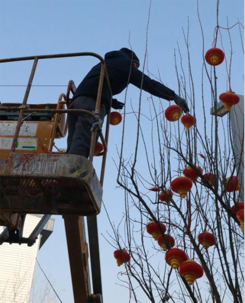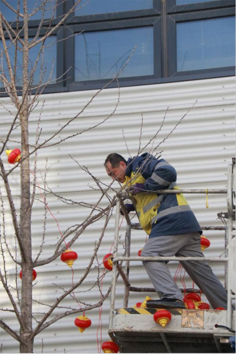 為給園區(qū)營造濃厚的節(jié)日氣氛,給入駐企業(yè)帶來如家般的溫情呵護(hù),沈陽航發(fā)展運(yùn)營管理有限公司物業(yè)團(tuán)隊,在零下二十度的氣溫下,凍紅了雙手,冰覆了睫毛,但他們依然堅守,扶梯的扶梯、攀爬的攀爬,將火紅的燈籠掛在園區(qū)主干道、企業(yè)門前。滿街的火紅,是他們對園區(qū)的熱愛,也是對工作的執(zhí)著,更是對崗位責(zé)任的滿滿執(zhí)念。園區(qū)的燈亮了,客戶們洋溢的笑臉,映襯著角落里一道道靚麗的風(fēng)景線,夜幕降臨下,五彩斑斕的彩色燈光給園區(qū)增添了不少喜慶的色彩,也深深的印在了師傅們熱切的心里。